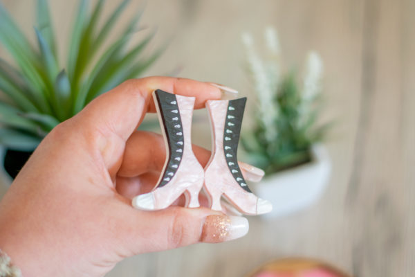 Botas de metacrilato cortadas a láser y pintadas y montadas a mano.