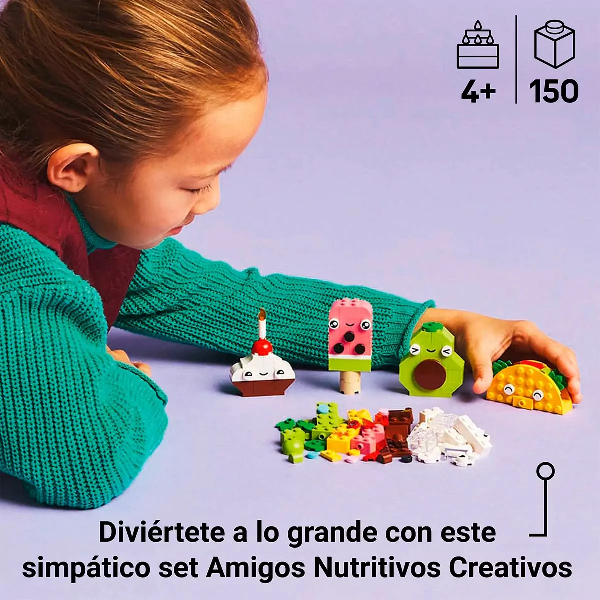 Los peques usan el cautivador surtido de ladrillos LEGO de colores y piezas especiales (ojos, bocas y elementos decorativos) para construir 4 simpáticos amigos nutritivos: un cupcake, un helado, un aguacate y un taco. Luego mezclan los ladrillos para convertirlos en una tarta con chispitas, un té de burbujas, una pera y un bocadillo. Cuando adquieran confianza, pueden seguir la guía y cambiar las expresiones, las formas y los colores para hacer nuevos amigos nutritivos, como un helado verde, un brik de zumo, una raja de sandía, una chocolatina y un mega sándwich.