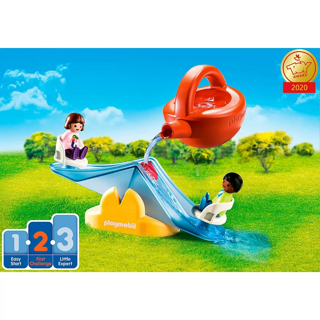 Regar, remar, salpicar: Los más pequeños también pueden divertirse con el agua fresca en el jardín o en el balcón. Con el Balancín Acuático con Regadera de Playmobil, los más pequeños se encuentran con su primer reto: de repente, las figuras se balancean hacia arriba y hacia abajo en cuanto se riega el balancín con agua. Los pequeños aficionados al agua tienen que descubrir por sí mismos la cantidad y la rapidez con la que hay que verter el agua. Lo mejor de todos los artículos de Playmobil 1.2.3: no contienen partes que se puedan tragar. Por lo que, los juguetes son aptos para niños y niñas más pequeños.