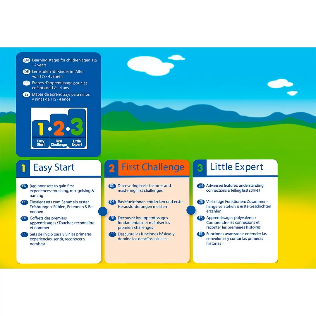 Con el segundo nivel de artículos 1.2.3 Aqua, los pequeños aprendices se enfrentan a sus primeros retos de una forma totalmente lúdica que fomenta la motricidad fina y la comprensión cognitiva de los más pequeños. Así, a través de las distintas funciones de juego, comienzan a comprender las relaciones causa-efecto.