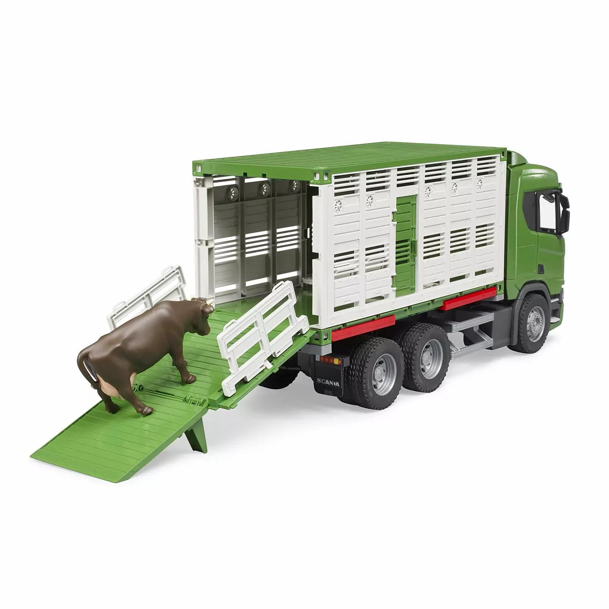 El camión de transporte de animales incluye todo lo necesario hoy en día para un transporte adecuado y adaptado a los animales: carga y descarga de animales sin peligro de lesiones mediante una rampa abatible y ampliable con rejas que pueden plegarse hacia arriba, rejas separadoras interiores plegables para ajustarse a la necesidad de espacio de las diferentes especies, bebederos que se pueden colgar, etc. Se incluye una res a escala de Scania, además de vacas y toros adicionales con los números de artículo 02308 y 02309. La nueva cabina del conductor muestra el diseño dinámico típico de Scania. Dispone de retrovisores exteriores abatibles y de puertas que se pueden abrir, y también se puede complementar con un módulo de luz y sonido (n.º de artículo 02801).