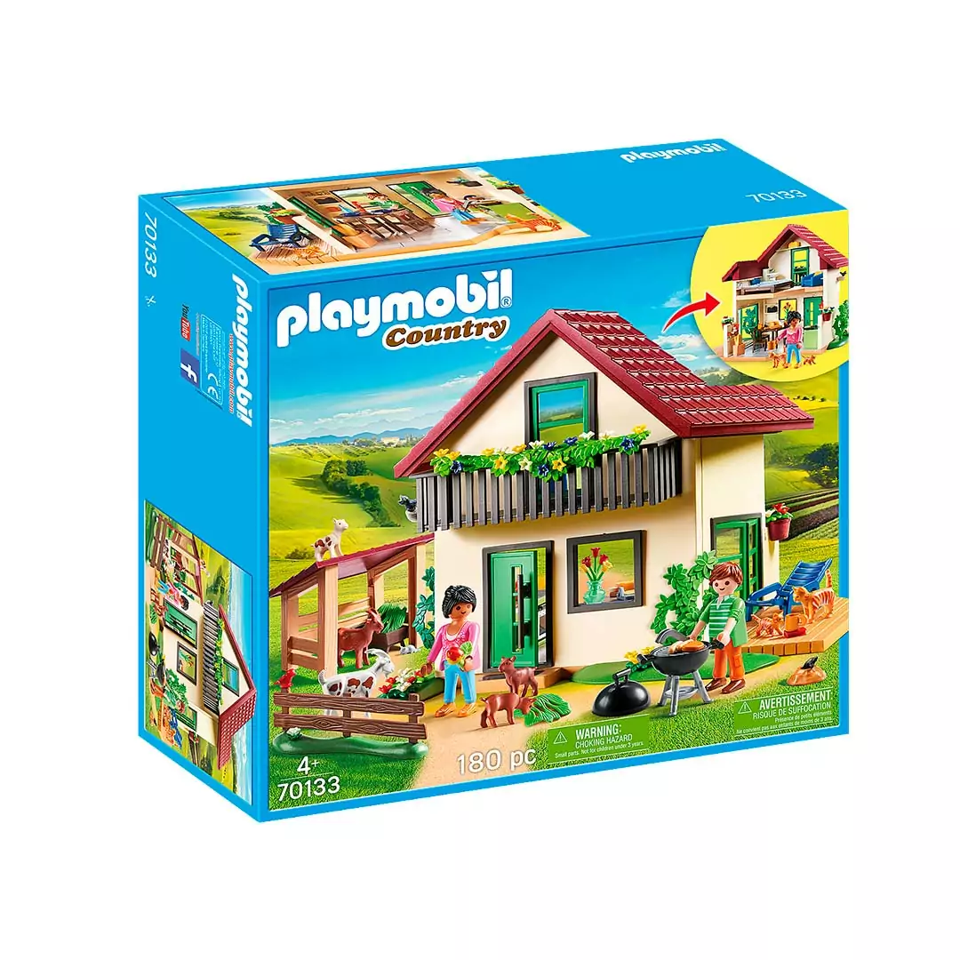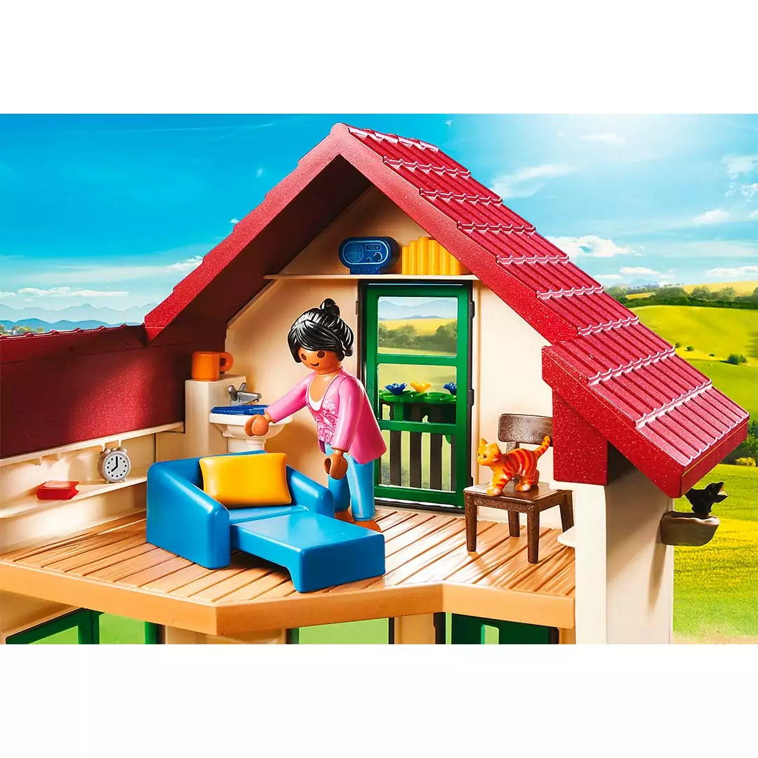 La familia vive muy a gusto en esta acogedora casa de campo con cocina-comedor y dormitorio con baño. Papá hace una barbacoa en el jardín, mientras que mamá vigila a las cabras, que están en su recinto. ¡Después de un intenso día de trabajo, no hay nada como relajarse en la tumbona de la terraza con una taza de té! La casa de campo cuenta con una cocina-comedor totalmente equipados en la planta baja. Mamá hace la comida y papá pone la mesa. ¡Que no falte el kétchup para la barbacoa! Hasta los gatos están deseando hincarle el diente… En la planta superior de la casa de campo se encuentra el dormitorio con baño. El sofá cama invita a quedarse y relajarse. Desde el balcón, se respira el aire fresco del campo.