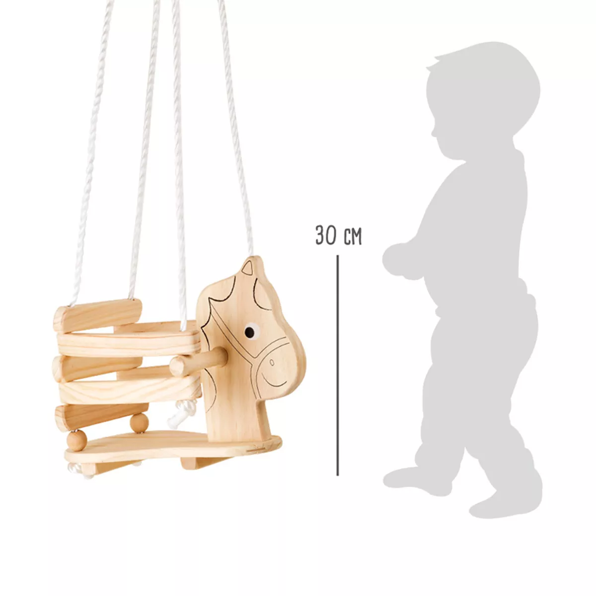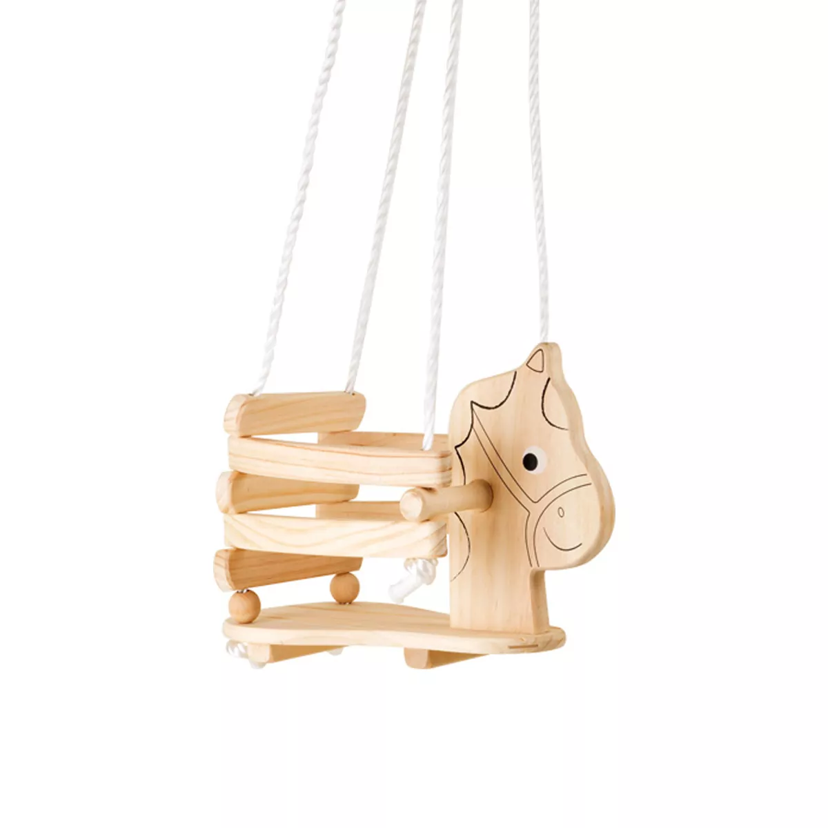 El columpio ideal para los más pequeños de la casa. Bonito columpio para niños y niñas en forma de poni de madera natural con asas para sujetarse. Borde sólido y estable para un ajuste seguro. Altura regulable gracias a las cuerdas ajustables. Agradable sensación táctil gracias a los bordes redondeados. Anillas metálicas para colgar y descolgar rápidamente en interiores y exteriores. Ideal para que los más peques de la casa sientan el balanceo de un auténtico poni.