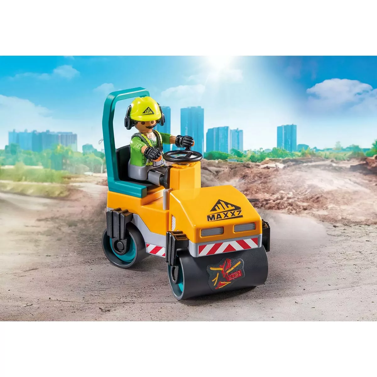El rodillo de PLAYMOBIL se convierte en tu aliado para aplanar el asfalto sin contratiempos. Sus ruedas giratorias se adaptan al pavimento, mientras el asiento para una figura garantiza precisión y seguridad. Conduce sobre el tramo cerrado y aprovecha la varilla de medir para calcular cada ángulo. Este trabajo coordinado crea un resultado impecable, dejando el camino listo para cualquier vehículo que necesite pasar. Todo ocurre de forma ágil con el esfuerzo de los dos obreros.
