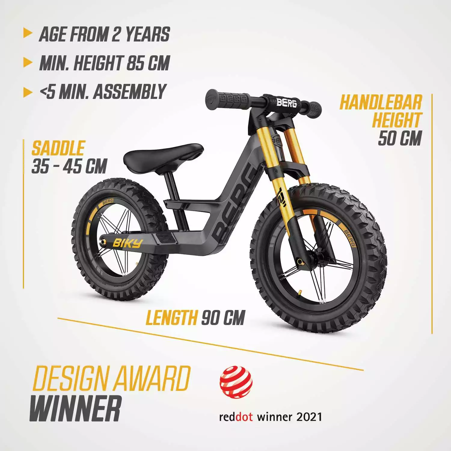Tanto si quieres explorar la ciudad como disfrutar de un terreno más accidentado, esta BERG Biky grey está preparada para la aventura. Al igual que los demás modelos de la familia BERG Biky, esta bicicleta de equilibrio tiene un cuadro ultraligero, un limitador de desviación del manillar seguro, un sillín ajustable y cómodas ruedas neumáticas. Esto permite que esta robusta bicicleta de equilibrio gris esté lista para cualquier aventura. ¿Tú también estás preparado?