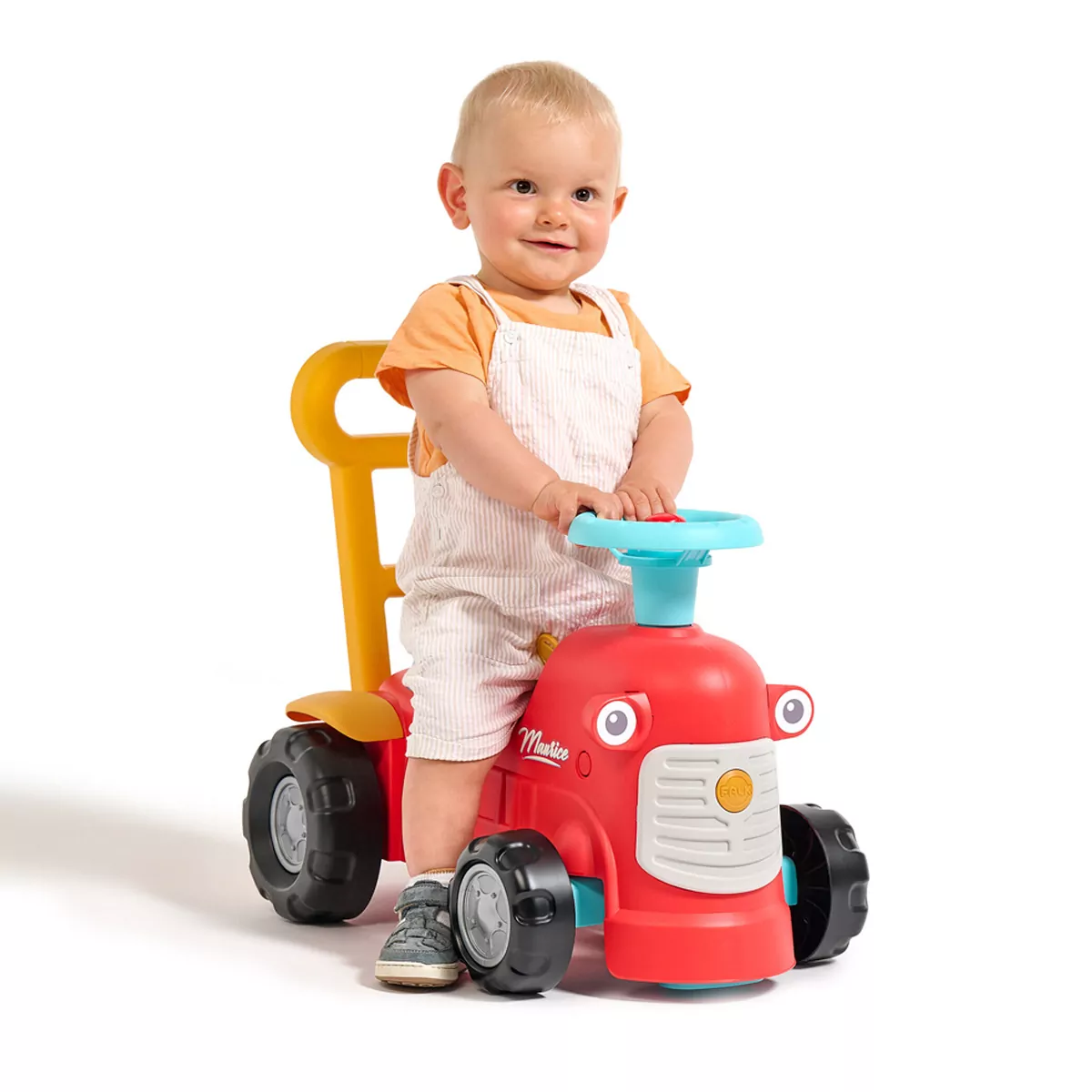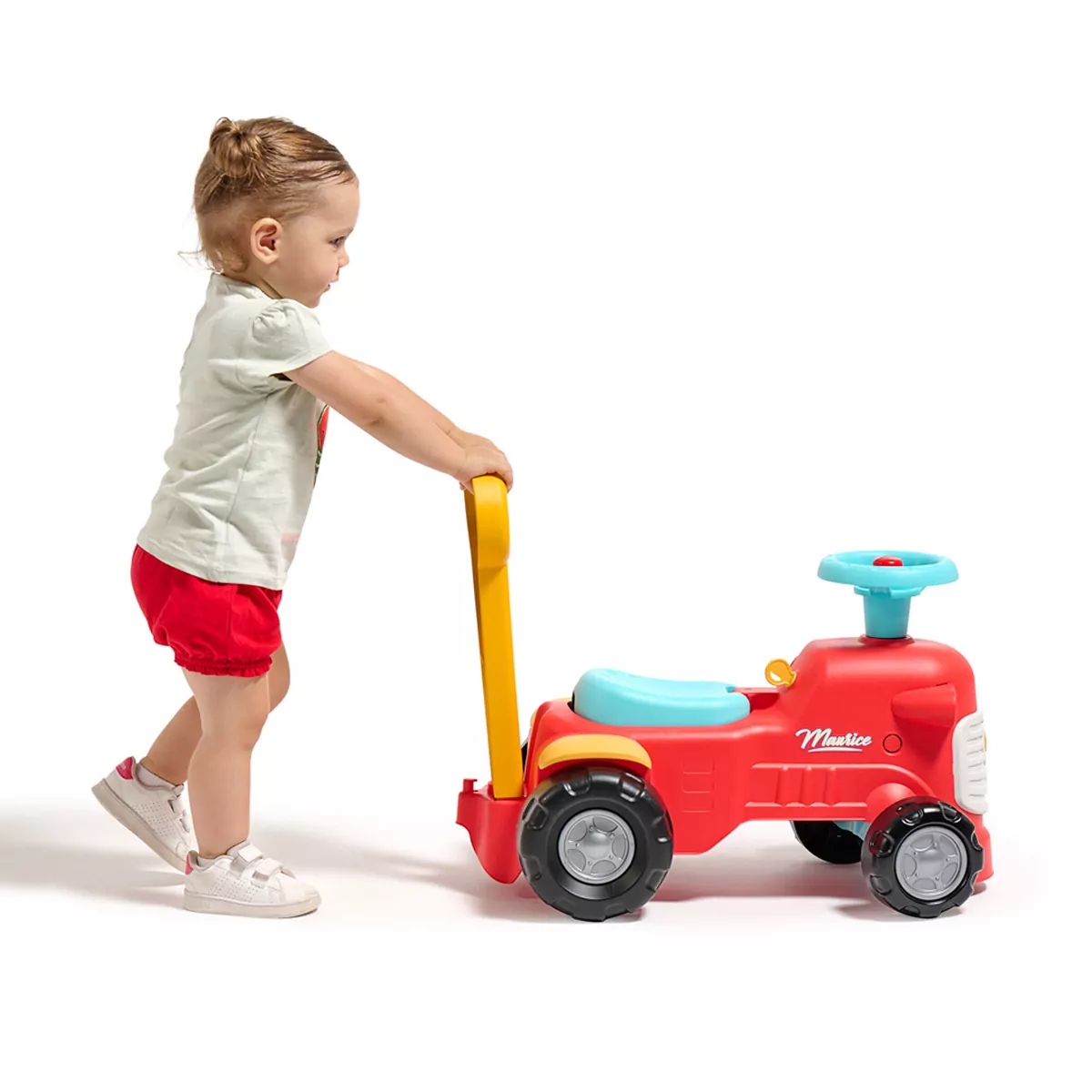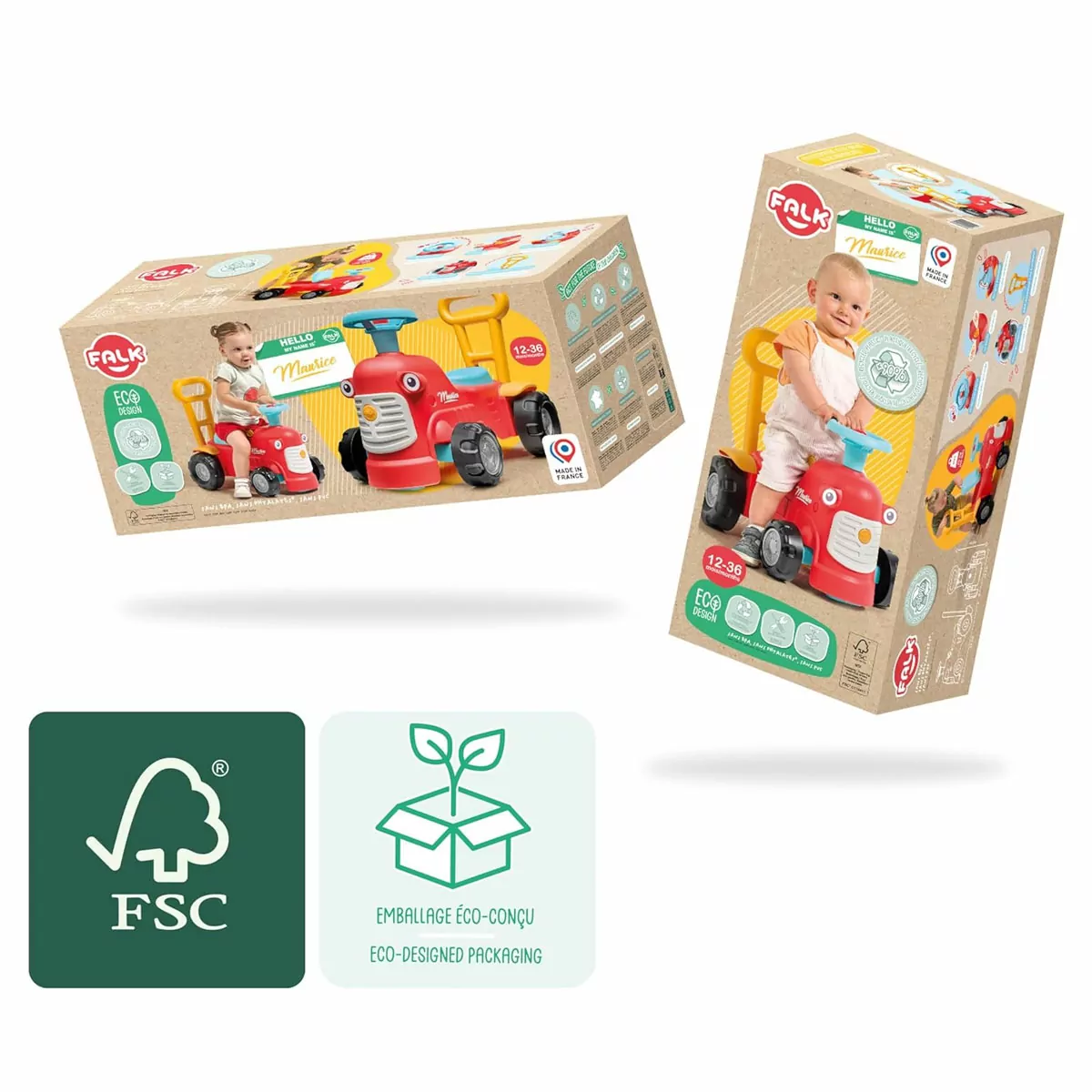 Maurice es un pequeño y bonito tractor lleno de trucos! Acompaña a tu hijo desde 12 meses hasta sus primeros pasos gracias a su barra ergonómica que le ayudará aprender a caminar. Gracias a sus bonitos colores, su pequeña llave de sonido y su volante direccional con bocina desarrollará sus habilidades psico-motrices. Un pequeño correpasillos con el que Falk rinde homenaje a 75 años de know-how mientras mira positivamente hacia el futuro de nuestros pequeños con acciones eco sostenibles. Por eso Maurice está hecho de plástico reciclado al 90% y fabricado íntegramente en Francia con mucho mimo.