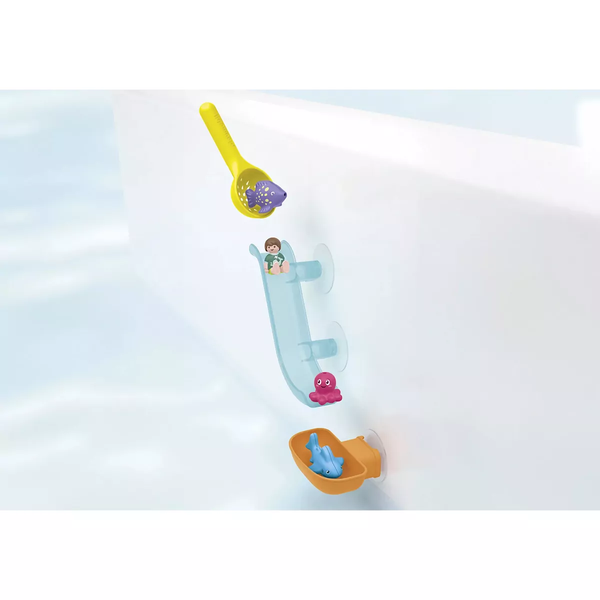 - Figuras: 1 niño; Animales: 1 bebé tiburón, 1 bebé pulpo, 1 pez globo; Accesorios: 1 tobogán acuático con ventosa, 1 bandeja de recogida con ventosa, 1 red de aterrizaje