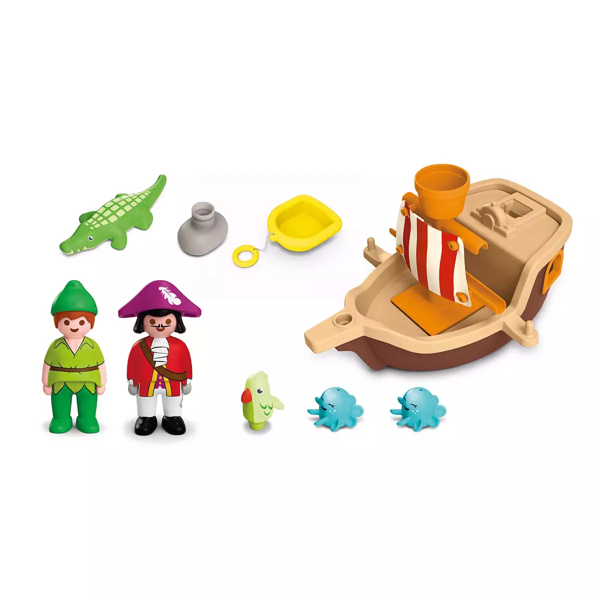 - Figuras: 1 Peter Pan, 1 Capitán Garfio; Animales: 2 pulpos, 1 cocodrilo, 1 loro; Accesorios: 1 barco pirata con mástil, 1 embarcación auxiliar, 1 bombilla pulverizadora