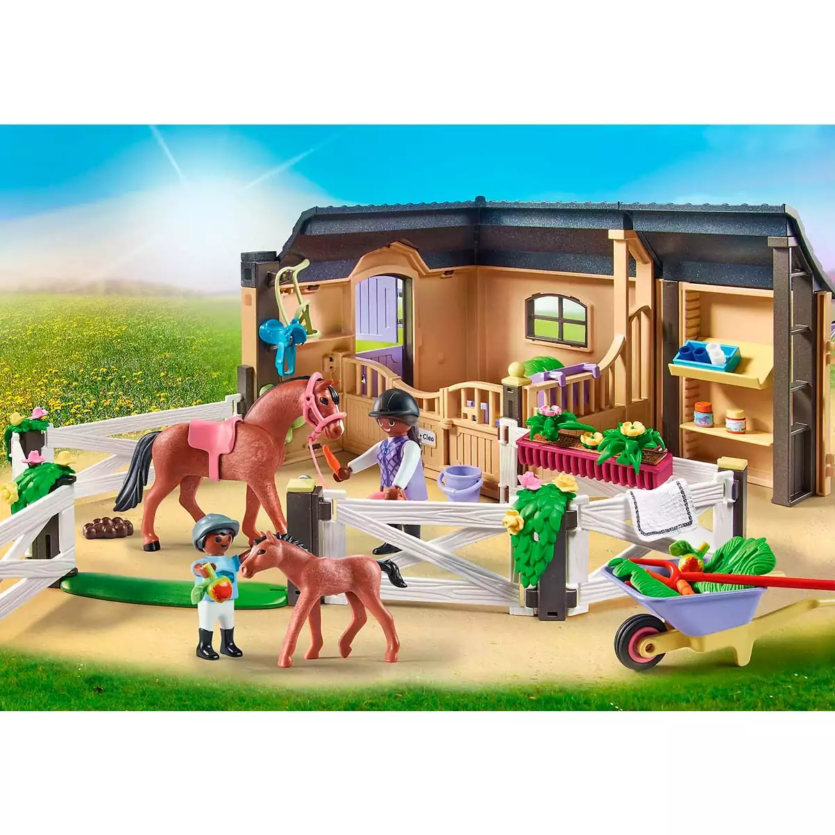 ¡Mucha diversión en el Establo de Playmobil! Este detallado set hará las delicias de los aficionados y aficionadas a los caballos. En el box, los simpáticos niños cuidan al querido caballo y al pequeño potro. Asear, cepillar y, por supuesto, limpiar el establo, todo forma parte de la rutina diaria. Después del entrenamiento, la silla de montar, el cabestro, las riendas y el casco se limpian y se guardan cuidadosamente.