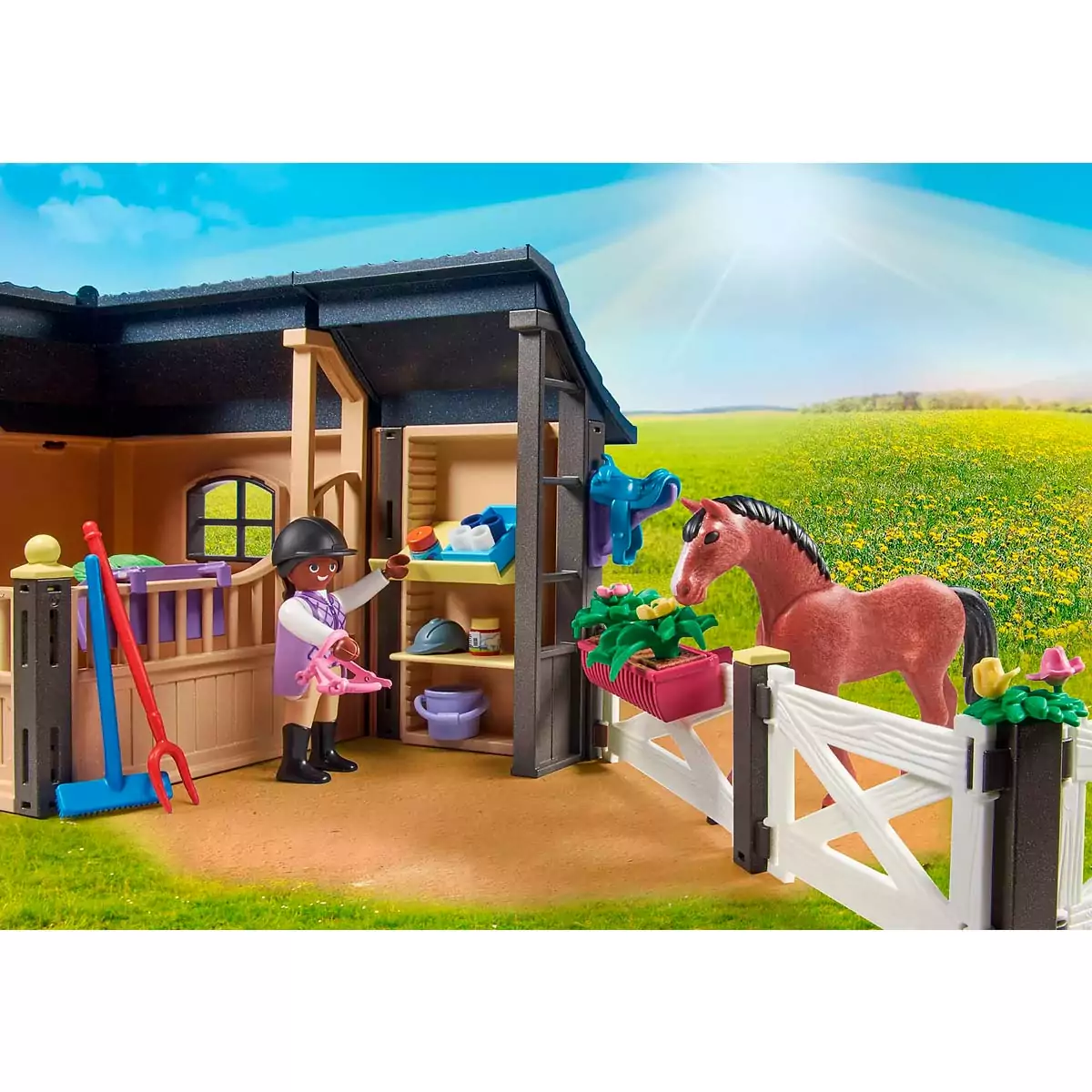 Además de dos figuras Playmobil, el set incluye un establo con vallas, un rastrillo, una silla de montar, un kit de aseo, una carretilla y muchos otros extras. Los niños pueden rotular ellos mismos la etiqueta en blanco adjunta y pegarla en la puerta del establo o del box del caballo.