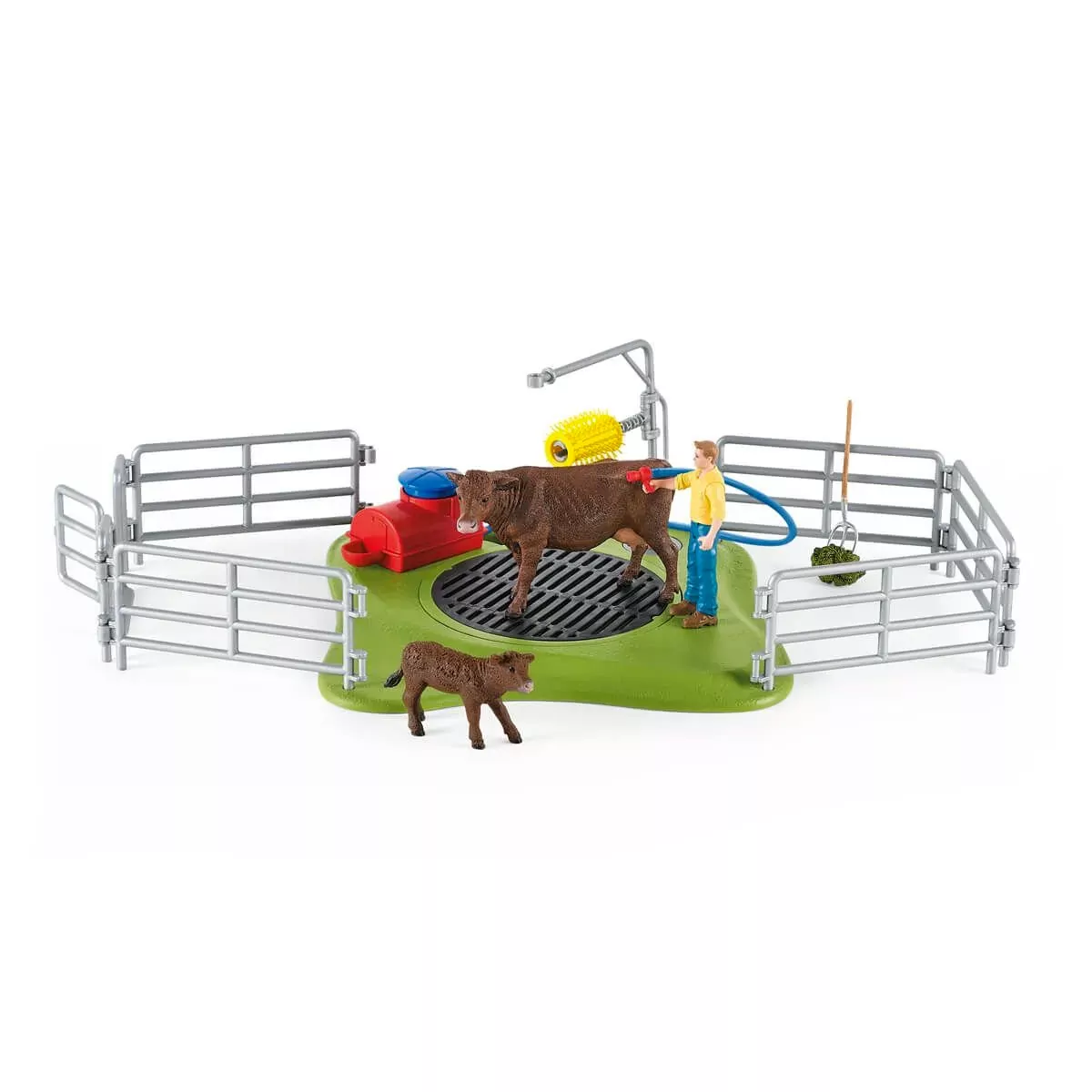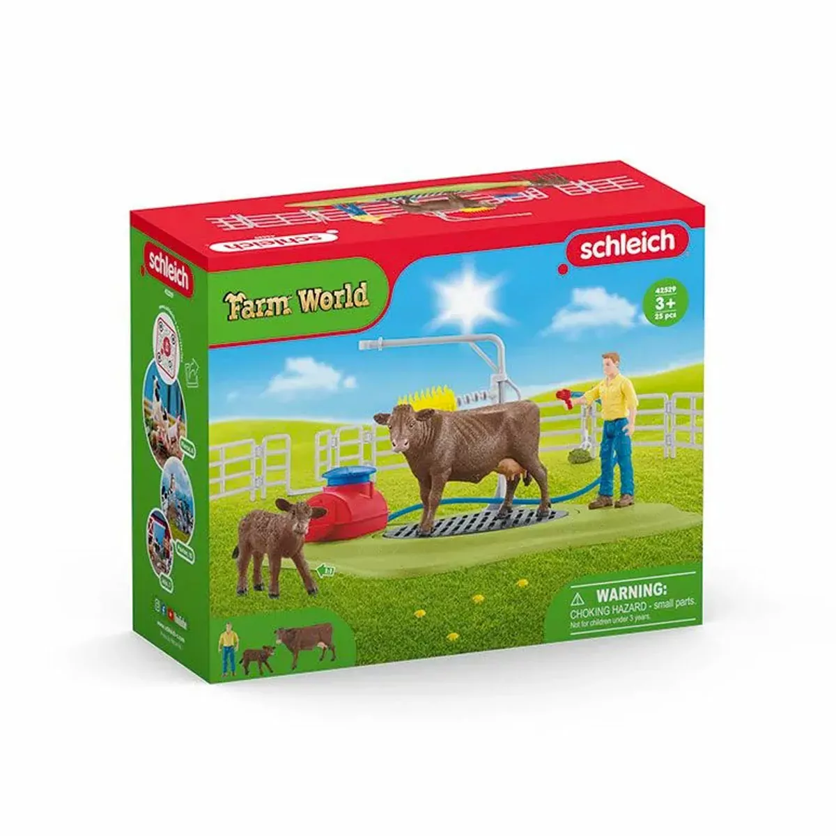 Los playsets de Schleich® están diseñados para dar un gran valor de juego, potenciando el rol de imitación e imaginación. Calidad Schleich®. ¡En la nueva estación de lavado para vacas de Schleich® FARM WORLD hay mucho movimiento! Las vacas vienen del prado y es necesario lavarlas antes de volver al establo. El ternerito está especialmente curioso. Es la primera vez que entra en la estación de lavado junto con su madre. El granjero Martin de FARM WORLD ha encendido la bomba de agua (con agua de verdad) y ya puede comenzar el lavado: ¡Qué divertido! El ternerito se queda en el plato giratorio para que lo laven por todas partes. Después de la ducha del granjero Martin de FARM WORLD, pasan rápidamente al cepillo para dar masajes. ¡Es tan divertido!