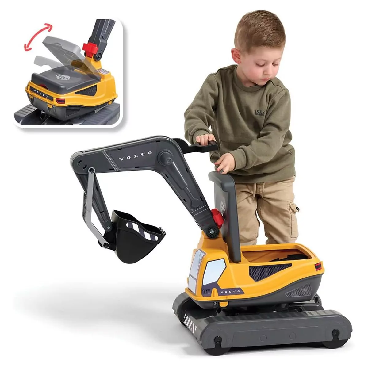 No hay trabajo demasiado grande para los pequeños constructores equipados con esta excavadora Volvo con cabina giratoria 360° equipada con asiento abatible y su pala mecánica totalmente articulada ¡como las de verdad!