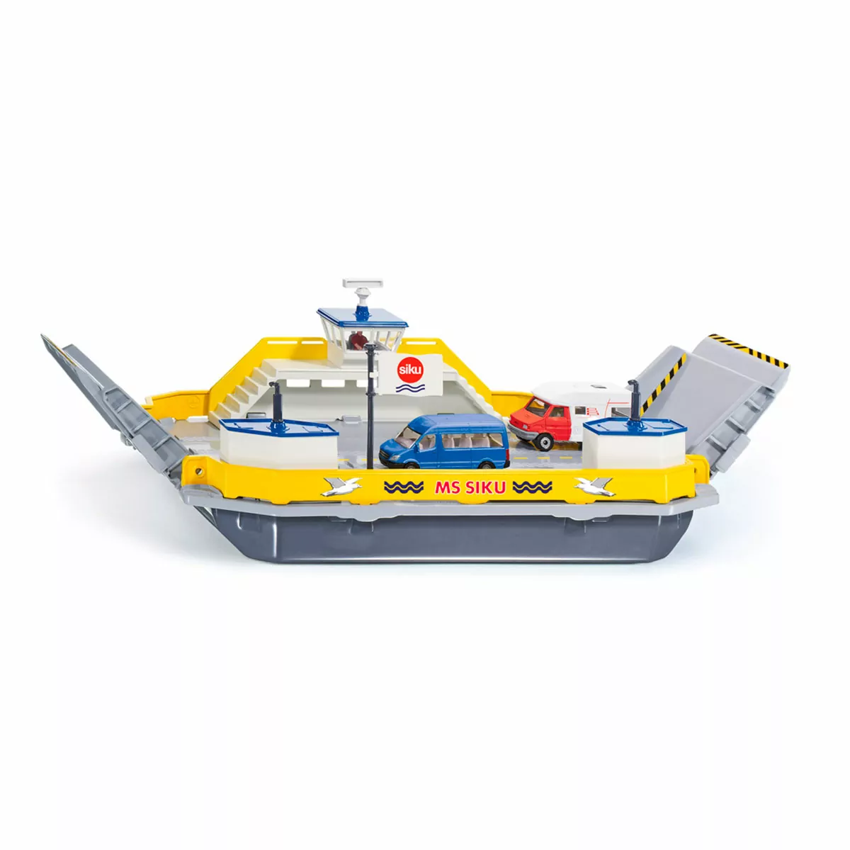 Transbordador de coches flotante a escala 1:50 para transportar hasta 6 coches o 2 camiones de juguete – Numerosas características: Rampas funcionales, Se desplaza también sobre tierra gracias al mecanismo que rueda, Puertas funcionales – Innumerables combinaciones posibles en el mundo siku para mayor diversión, ej. cargar coches de juguete siku de la misma escala – Ideal como regalo, Combina perfectamente con otros productos siku – Contenido: 1x siku 1750 Ferri de coches, Incl. 2 coches de juguete, Escala: 1:50, Material: Metal/Plástico, Dimensiones: 43,7 x 18,4 x 14,2 cm, Peso: 0,76 kg, Color: Amarillo/Gris, Serie: SIKU SUPER