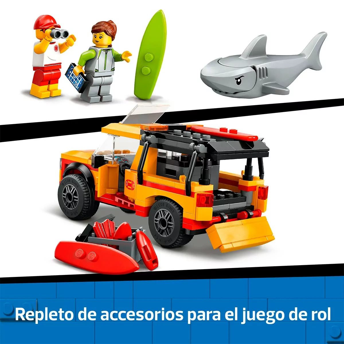 Furgoneta de juguete LEGO con divertidos accesorios: Este juego de playa infantil viene con accesorios, como 3 tablas de surf, 2 boyas de rescate, aletas, prismáticos, un megáfono, una botella de agua, un teléfono de juguete y un botiquín.