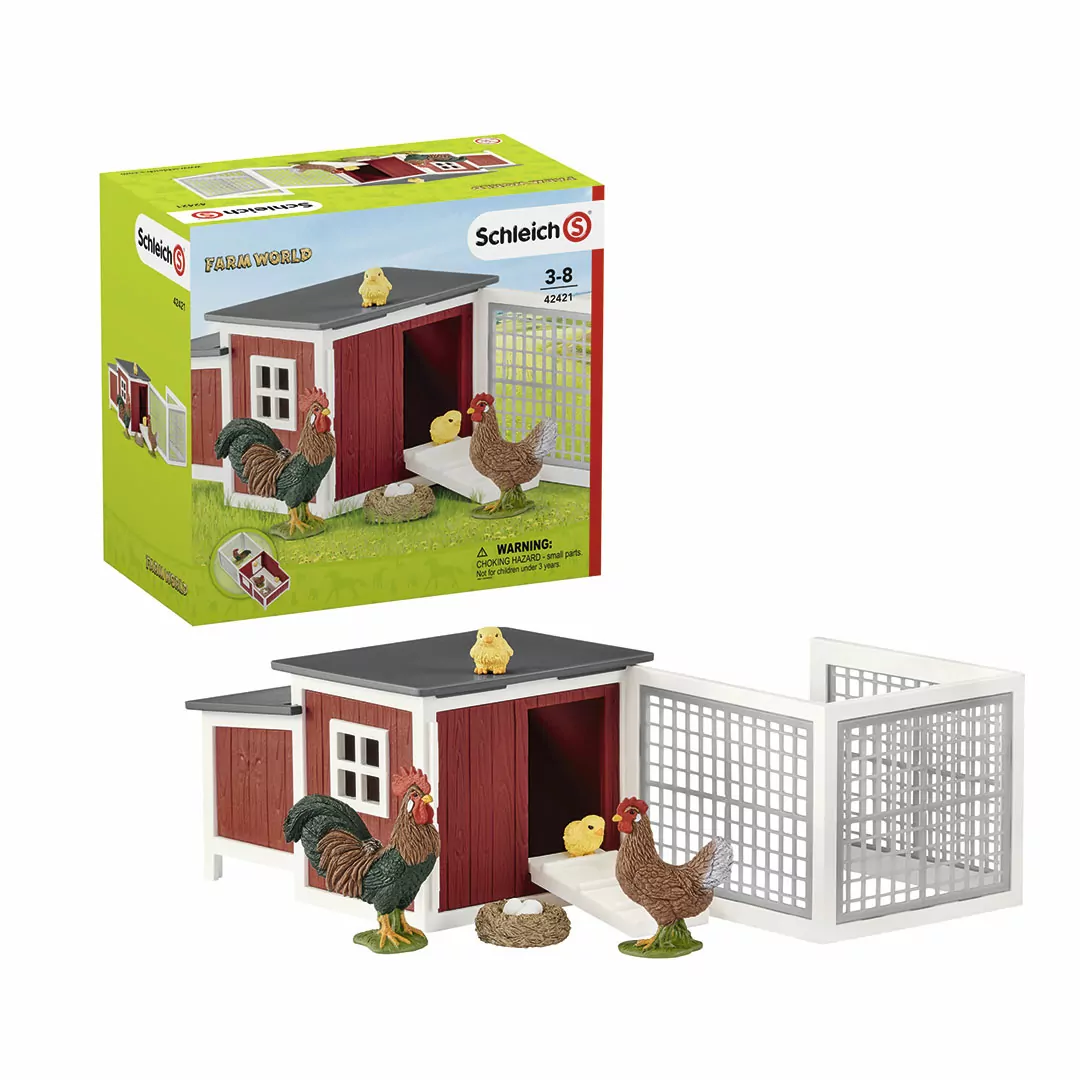 De madrugada, el gallo se sube al tejado del gallinero y empieza a cacarear. Con los primeros rayos de sol, también aparece la gallina. Empieza a arañar el suelo y a picotear en busca de semillas cuando se oyen ruidos que proceden del gallinero. El tejado está doblado y abierto y podemos ver el maravilloso secreto que se esconde dentro: ¡Los polluelos han salido del cascarón!