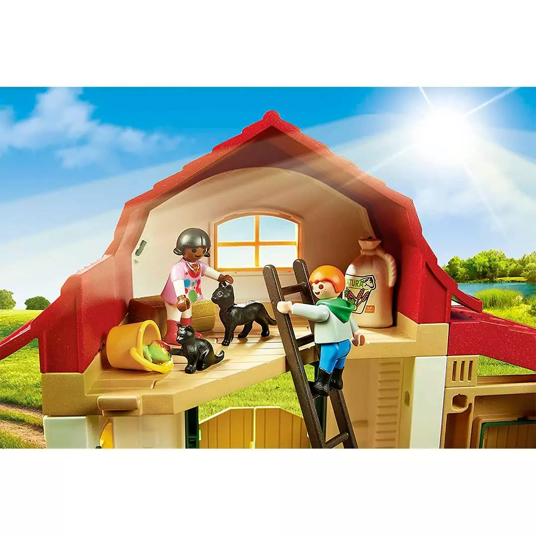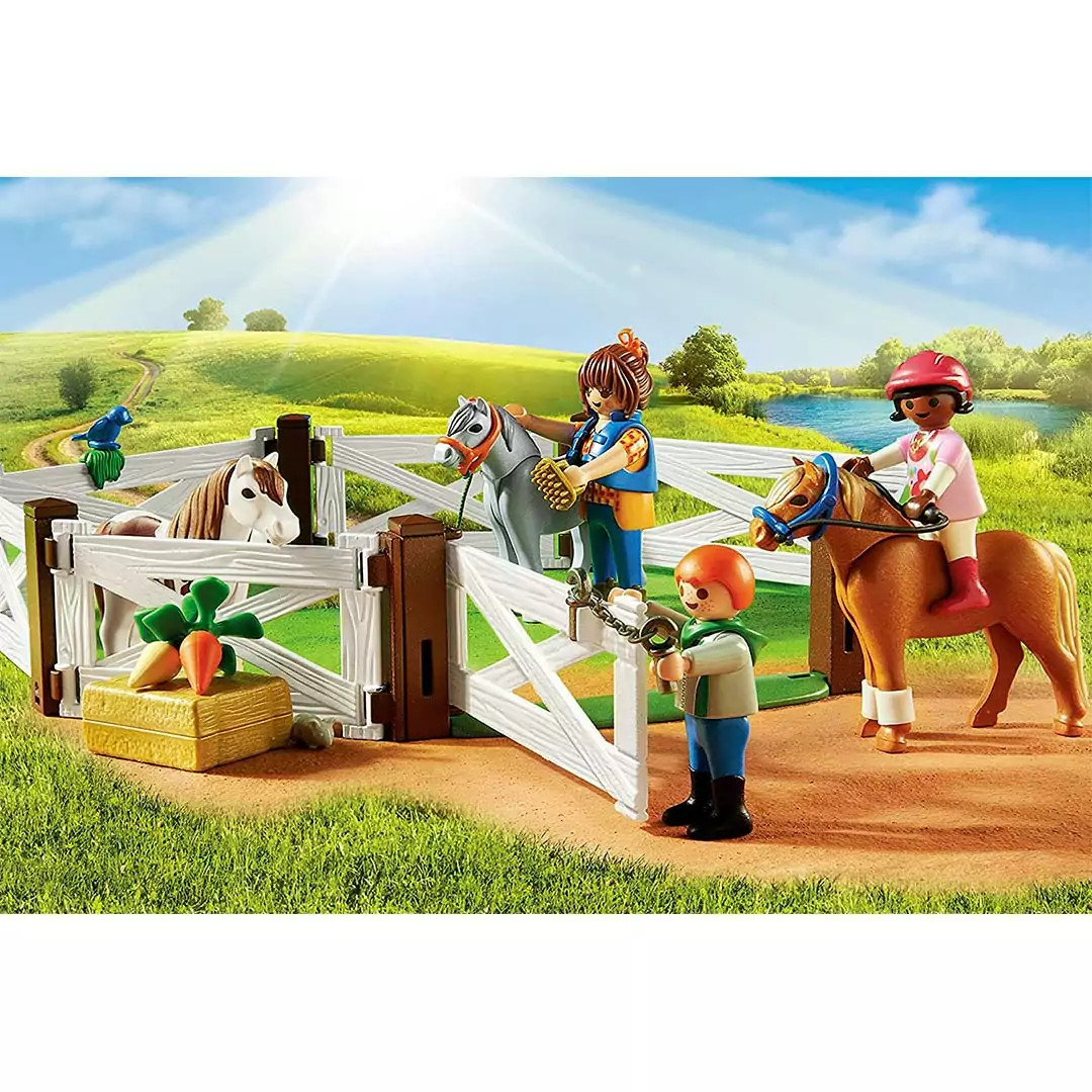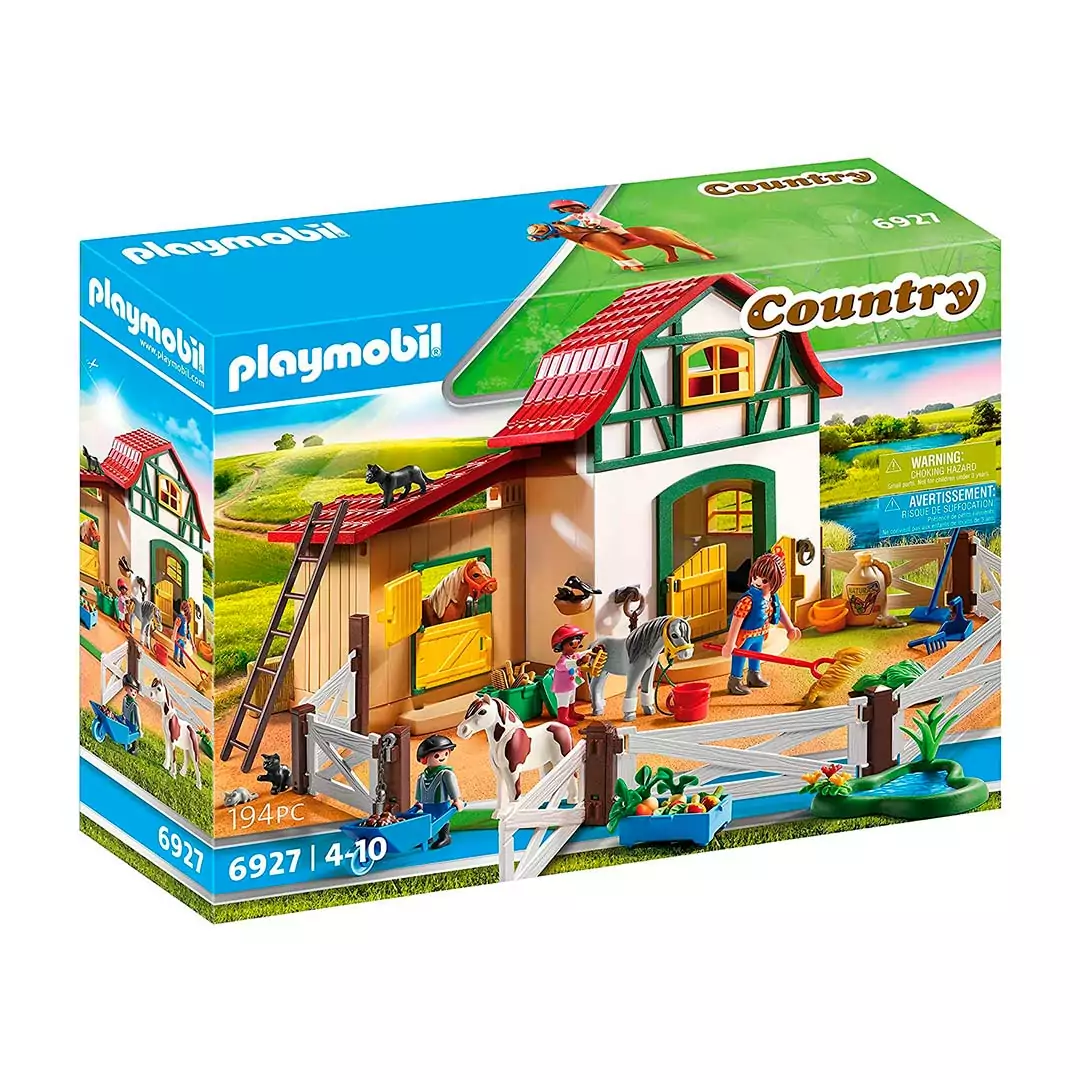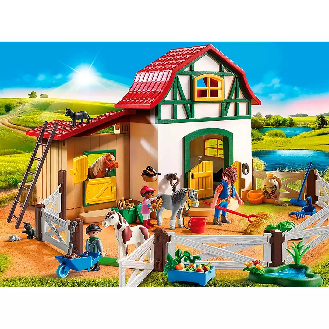 Con Playmobil Country nunca te aburrirás: paseos largos, torneos de aventura o accesorios para el cuidado de caballos en su establo. El diseño detallado de los numerosos artículos trae la variada vida cotidiana de la granja de caballos directamente a la habitación de los niños. Las puertas y portones se pueden abrir y junto con muchos accesorios y encantadores detalles garantizan horas de juego y diversión. Por lo tanto, la granja de ponis ofrece muchas posibilidades para nuevas historias una y otra vez hasta que los compañeros de cuatro patas se retiren a sus establos. La granja está llena de animales incluyendo gatos, golondrinas y uno que otro ratón. Cuenta también con accesorios para cercar el espacio en la parte delantera de la granja y evitar que los jóvenes ponis escapen o mordisqueen a escondidas la caja de verduras. Todos están ayudando en la granja de ponis, incluidos los niños, que pueden cabalgar a sus amigos de cuatro patas sin silla de montar o buscar heno fresco con la carretilla. En esta granja, todo está disponible para que los ponis puedan ser alimentados, aseados y limpiados antes de que respiren aire fresco en el establo.
