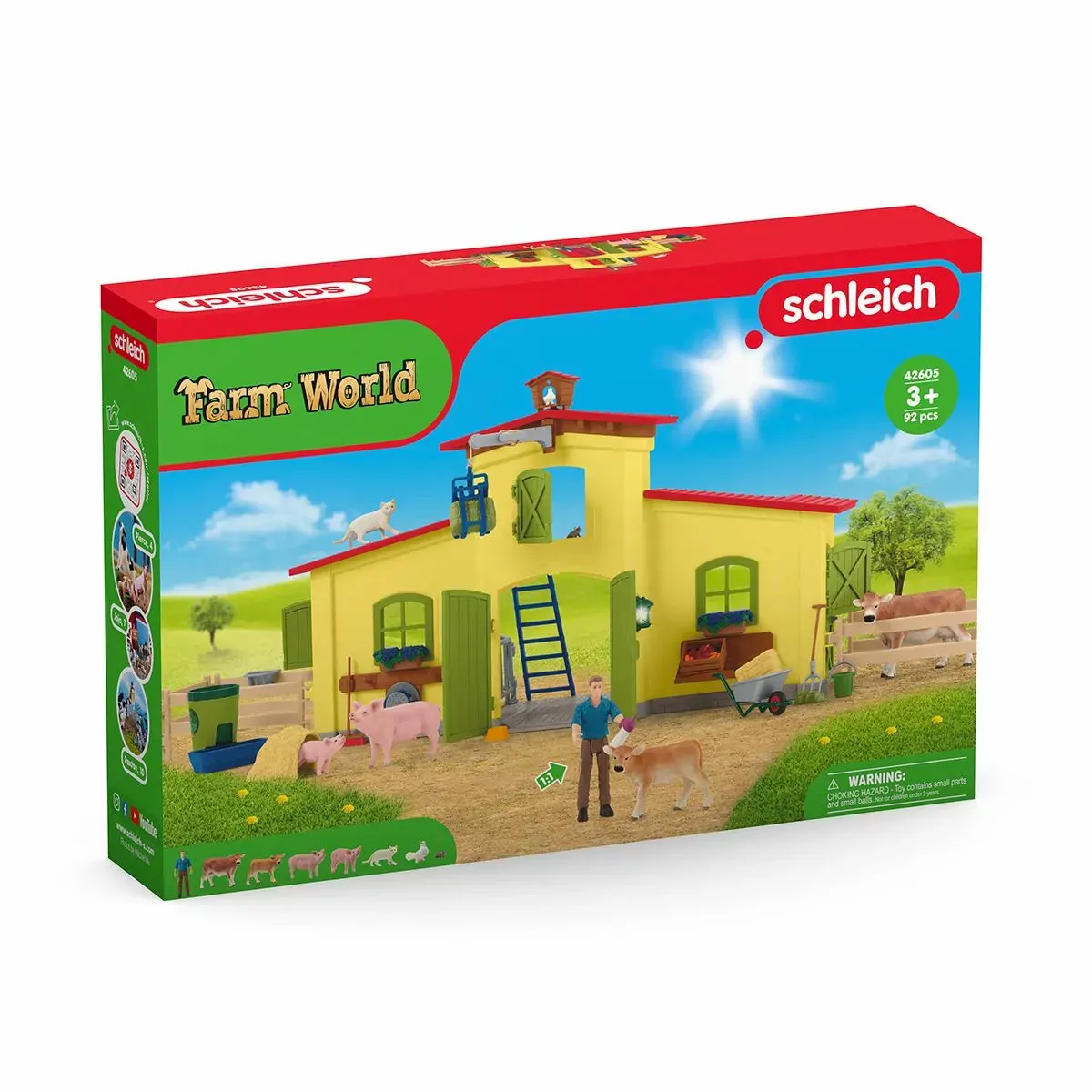 Los playsets de Schleich® están diseñados para dar un gran valor de juego, potenciando el rol de imitación e imaginación. Calidad Schleich® En el establo no da tiempo a aburrirse. ¿Sabes por qué? Porque hay que cuidar de todos los animales, vacas, cerdos, gatos y palomas. El granjero Paul recoge con el cabrestante el heno del pajar y lo distribuye con la horca entre los animales. Para alimentarlos más rápido, pone en marcha el carrusel de forraje. Solamente da el biberón al ternero. Como recompensa, se come una jugosa manzana.