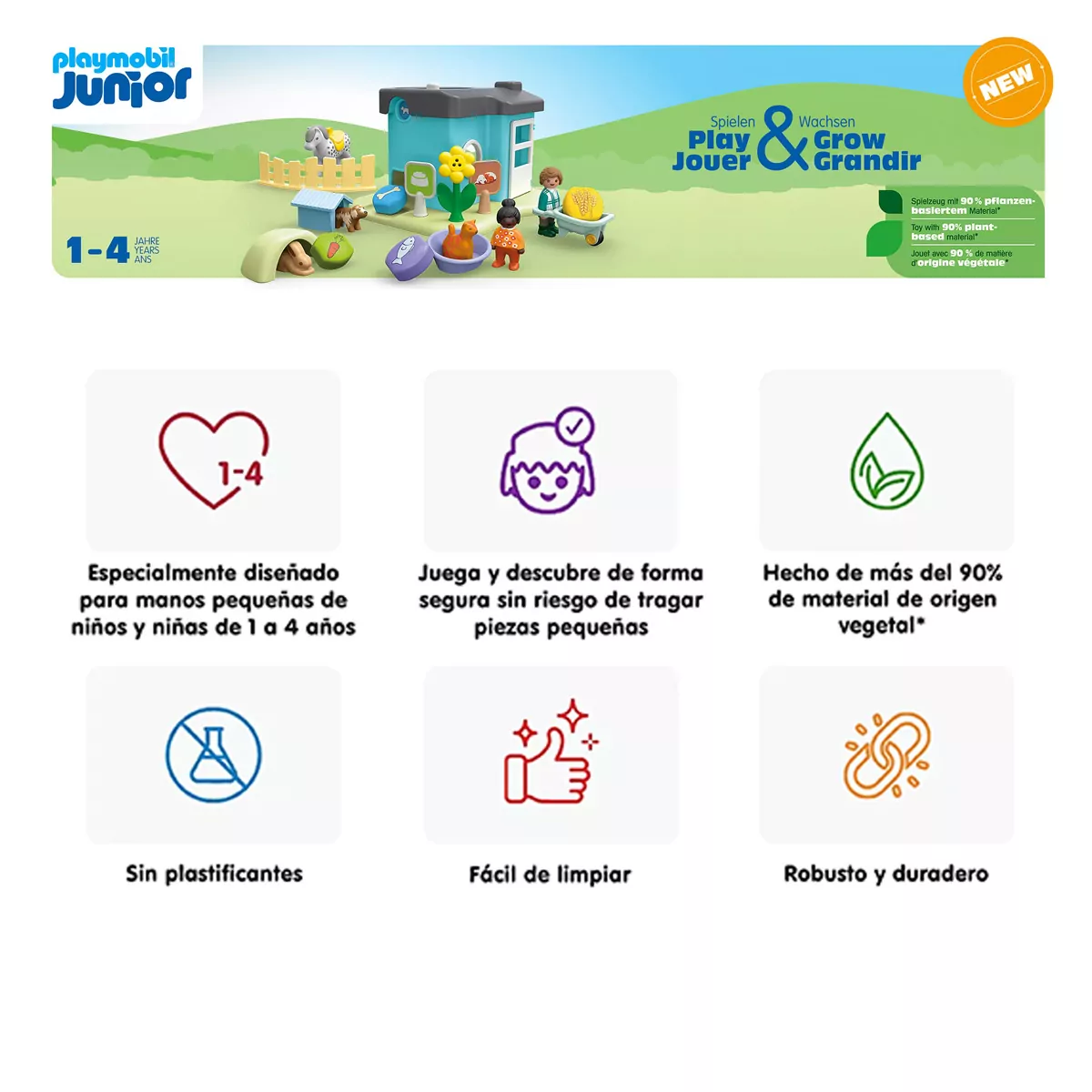 Los productos Playmobil Junior están fabricados con más de un 90% con plásticos de origen vegetal. Estos plásticos son tan resistentes y fáciles de cuidar como de costumbre. Para nuestros embalajes de Playmobil Junior, utilizamos al menos un 90% de cartón reciclado y un 100% de papel reciclado y, en la medida de lo posible, evitamos el plástico.