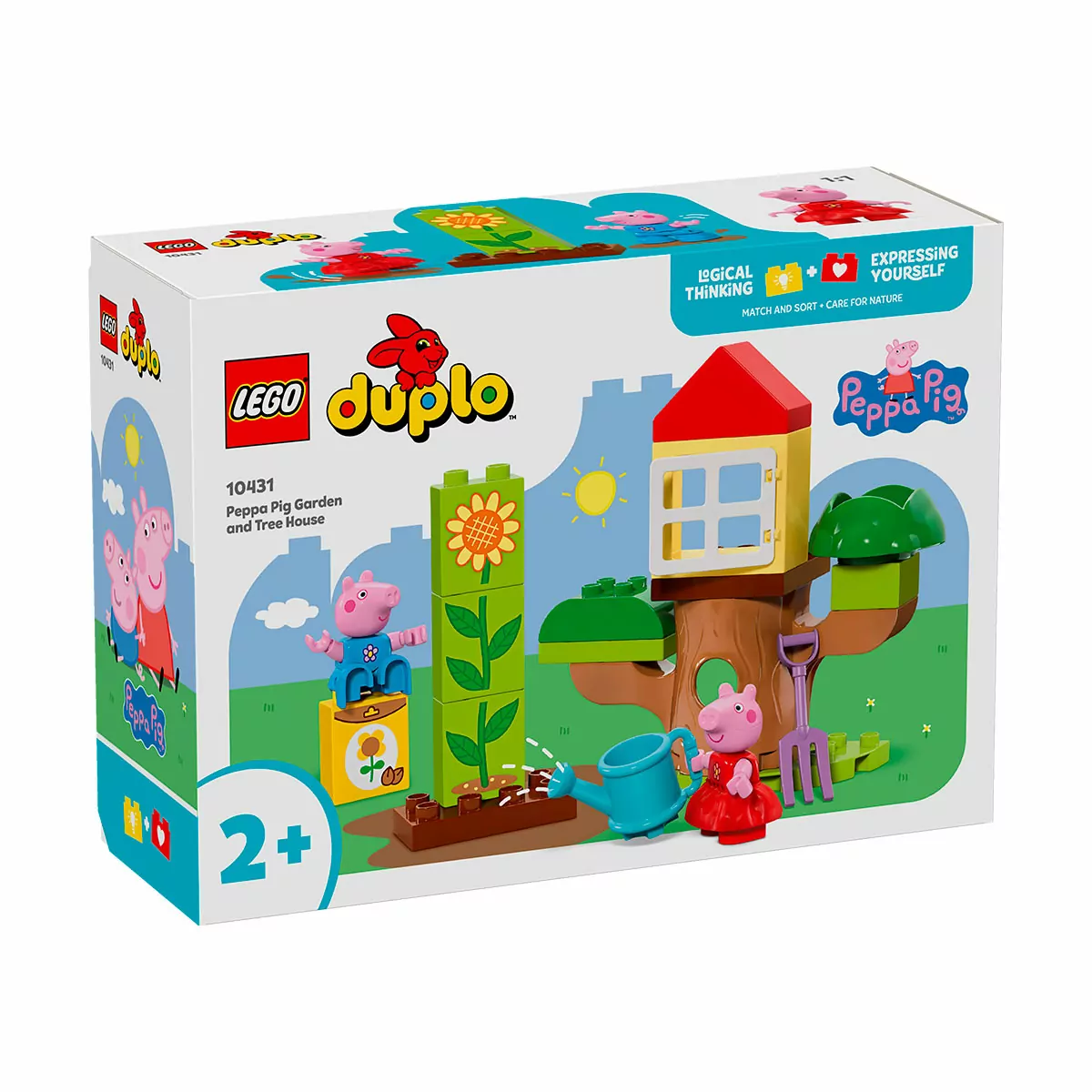 Muestra a tu bebé de 2 años o más lo fascinantes que son las actividades al aire libre con el set LEGO DUPLO Jardín y Casa del Árbol de Peppa Pig (10431). Este divertido juguete enseña a los más pequeños a amar la naturaleza mientras ayudan a Peppa y George a plantar un girasol. El juguete LEGO DUPLO de Peppa Pig para construir y reconstruir cuenta con numerosos accesorios creativos para inspirar a los pequeños fans de Peppa Pig, como una regadera de juguete y un rastrillo. Los bebés practican sus habilidades motrices finas y aprenden a emparejar y clasificar apilando los ladrillos para hacer crecer la planta. Después, las 2 figuras de Peppa y George pueden jugar al escondite o relajarse en la casa del árbol.