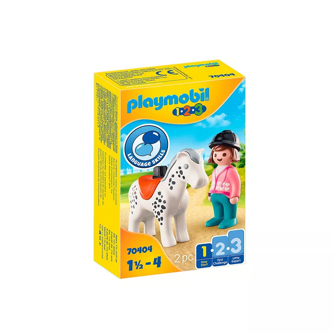A través de los ojos de los niños durante los primeros años de vida, todo es color ¡Y de gran tamaño! Para ayudar a los pequeños a descubrir y conocer esta realidad a través del juego, Playmobil 1.2.3 ofrece una colorida gama de juguetes para niños a partir de 1,5 años: A la brillante Jinete Playmobil le encanta pasar tiempo con su caballo blanco. A la jinete le encanta columpiarse a lomos del amigo de cuatro patas y cabalgar por prados y campos, no sin el casco protector en la cabeza, por supuesto. Esto no sólo es divertido, sino que fomenta especialmente el desarrollo del lenguaje de los pequeños exploradores. Lo mejor de los artículos de Playmobil 1.2.3: no contienen partes que se puedan tragar. Por lo que, los juguetes son aptos para niños y niñas más pequeños.