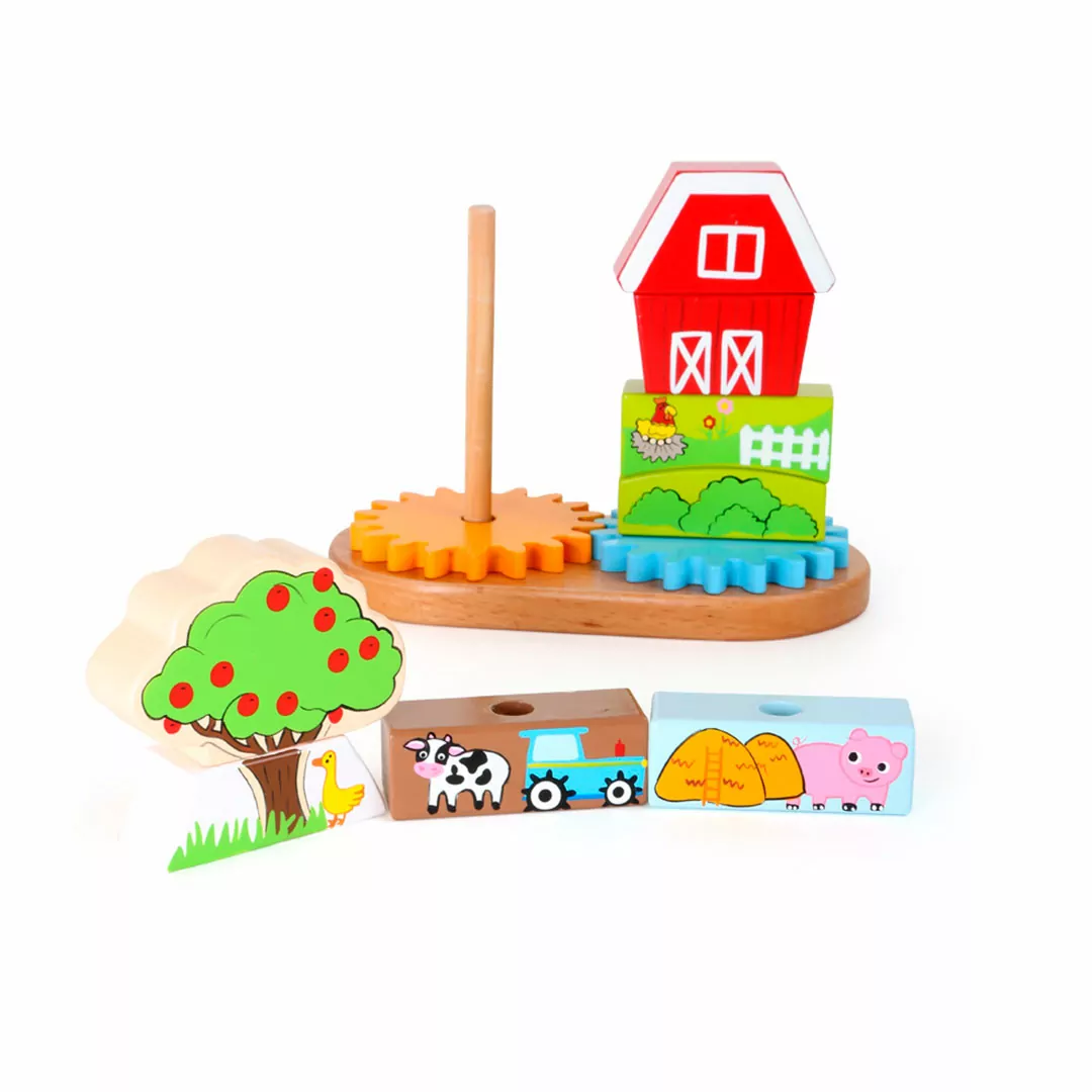 Esta granja de madera para ensartar piezas ayuda a estimular la motricidad fina de los niños. Las robustas piezas de madera están decoradas con motivos del campo y enseñan a los niños qué animales se encuentran en las granjas. Dos ruedas dentadas hacen posible una visión completa de este divertido juego.
