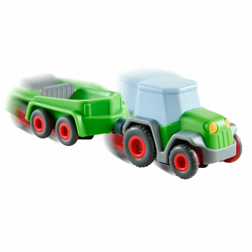 Este tractor con remolque recorre prados y campos, y por supuesto también las pistas Kullerbü. ¡Qué divertido! ¡Cómo se acelera el corazón de los pequeños amantes de la granja cuando deslizan su tractor! Tractor y remolque con motor de inercia y un estable soporte magnético para una velocidad extrarrápida. En el remolque se pueden transportar las bolas Kullerbü que podrán descargarse sobre la pista.
