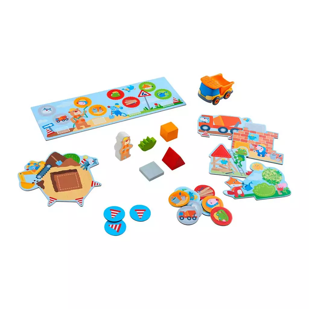 La tía de Pol se está construyendo una casa. Hay muchas cosas por hacer. En el plan de obras de Oso Bruno, el aparejador, está marcado el orden con el que deben realizarse todos los trabajos. De esta manera se sabe exactamente lo siguiente que hay que hacer y quién tiene que hacerlo. Ayudáis a encontrar las herramientas y a las personas profesionales correctas. Para ello necesitaréis dar la vuelta a la ficha correspondiente del plan de ejecución de las obras. Una vez encontrada podréis llevarla en el camión volquete hasta él y también recoger las piezas de madera de los depósitos de materiales y conducirlas hasta las obras. ¡Que os divirtáis mucho!
