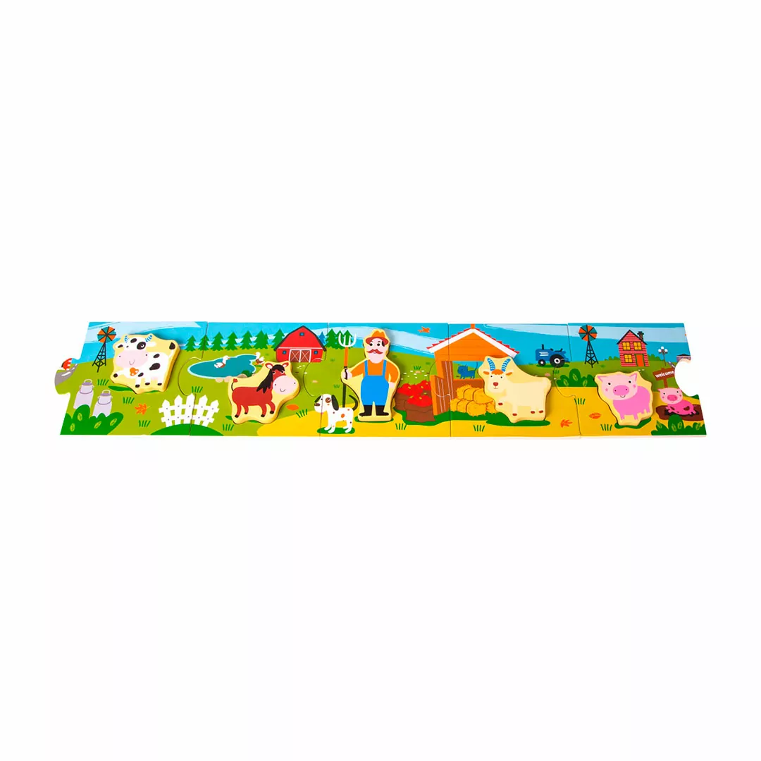 ¡Un día en la granja! Este puzzle de madera pintada es un bonito juego para los pequeños campesin@s y narrador@s de historias. Las cinco piezas grandes se arman rápidamente y después comienza la verdadera diversión del juego: cada parte es en sí misma un puzzle en el que hay que colocar a los animales de la granja. Este juego de armar estimula no solamente la motricidad sino también la fantasía y el desarrollo del lenguaje, porque al colocar paso a paso las partes nace una historia que el jugador puede inventar (¡y narrar!) ¡Un puzzle estupendo que garantiza la diversión por mucho tiempo!