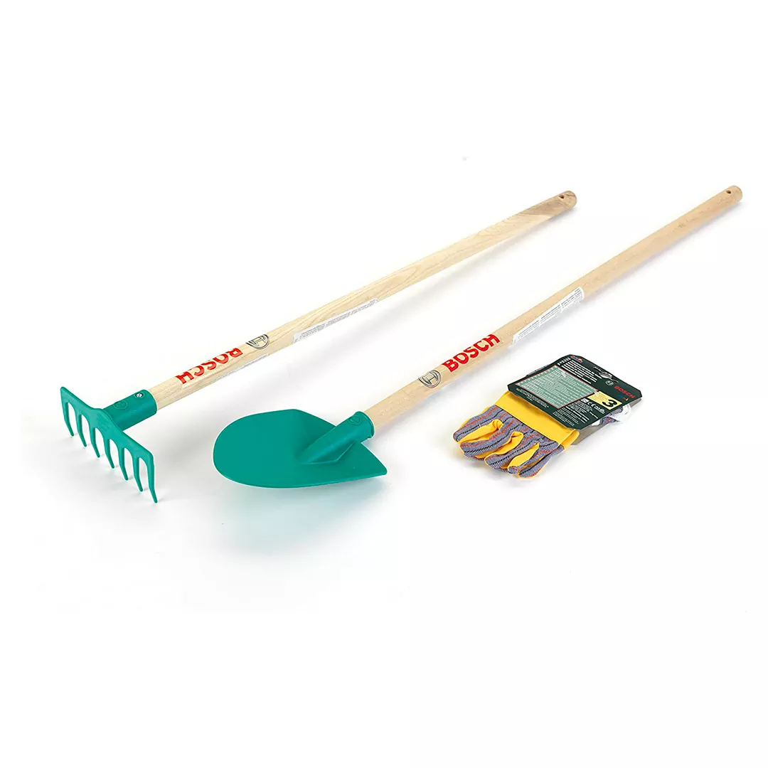 Entre los accesorios se encuentran una pala y un rastrillo con mangos robustos y prácticos ojales para colgar. Los guantes de jardinería son óptimos para los niños a partir de los 3 años, brindan momentos de felicidad, pero no protegen, ya que son de juguete.