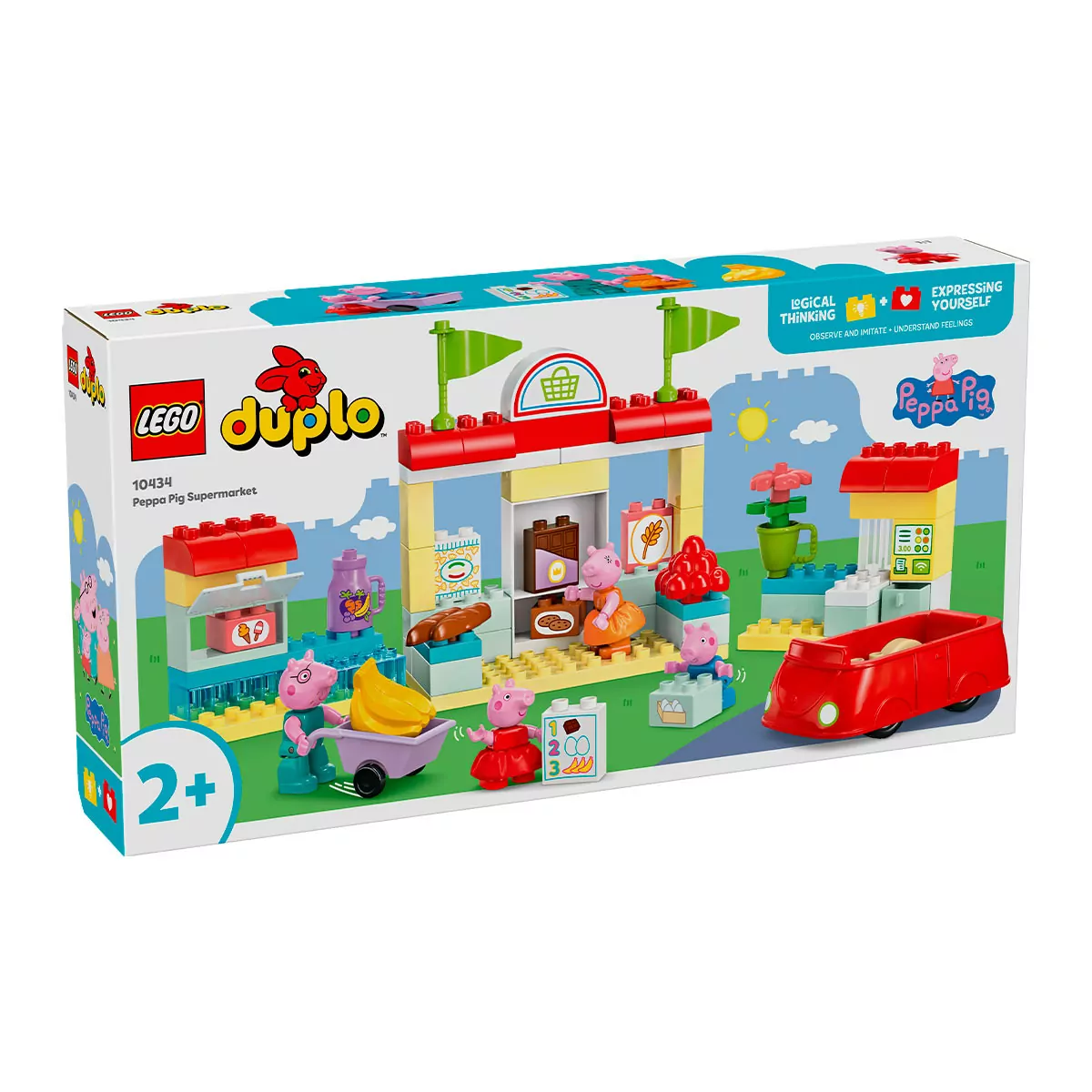 Ayuda a tu peque de 2 años o más a interpretar una visita a la tienda de alimentación con el juguete LEGO DUPLO Supermercado de Peppa Pig (10434). Las niñas y los niños en edad preescolar se convertirán en un miembro más de la familia Pig que va a comprar comida en el icónico coche rojo de la serie. El juguete de construcción viene lleno de accesorios para fomentar el juego creativo. Con las 4 figuras (Peppa Pig, George, Mamá Pig y Papá Pig), los más pequeños pueden jugar a que son los padres o los hijos mediante el juego de roles. Reconocerán el equipamiento que hay en los supermercados de verdad, como la caja de autoservicio, el carro y la vitrina refrigerada.