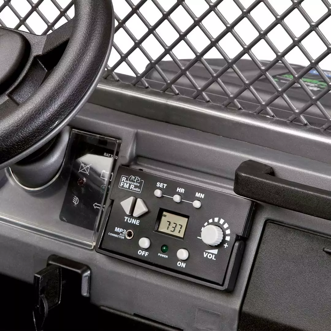 El salpicadero tiene una radio FM extraíble y portátil. Tiene una entrada de audio para lector MP3 (no incluido) y la función de fecha y hora.