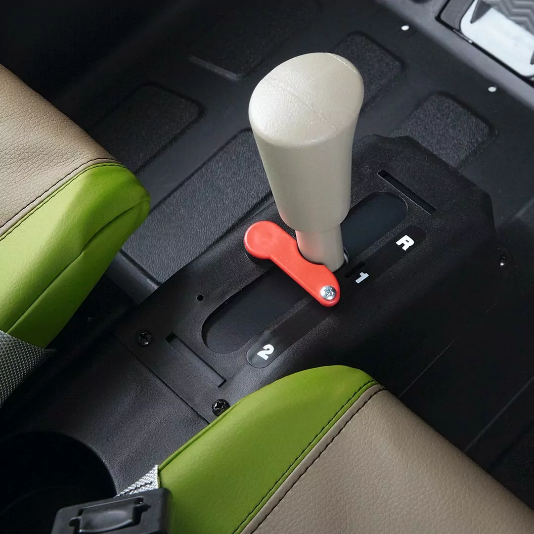 La palanca de cambio permite elegir entre dos velocidades de desplazamiento (5 u 10 km/h aproximadamente) y una marcha atrás. La velocidad más rápida se puede bloquear hasta que el niño se haya familiarizado con la conducción.