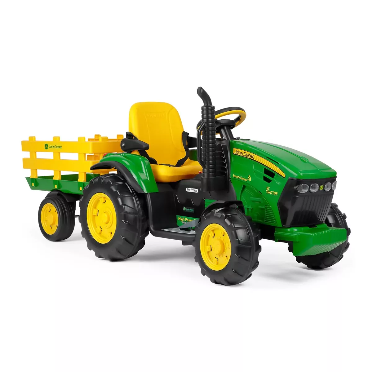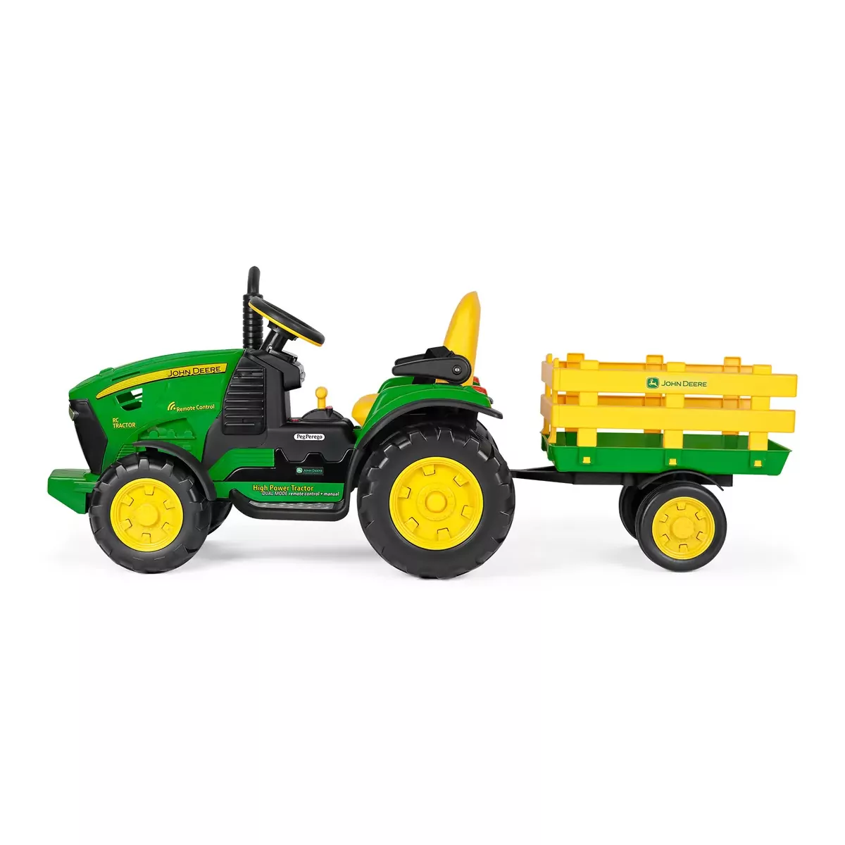 ¡El tractor eléctrico Radio Control John Deere con remolque 12V Peg Perego conducido por niños y controlado a distancia por adultos! El John Deere RC Tractor es el tractor eléctrico más deseado por niños y… por adultos. De 1 a 3 años, este tractor puede ser conducido por un adulto mediante control remoto; a partir de 3 años, puede ser conducido por niños para vivir fantásticas aventuras. Se desplaza estupendamente incluso por los terrenos más irregulares gracias a la potencia de sus motores de 330 W y a la tracción a 2 ruedas con banda de rodadura reforzada. Funciona con una batería recargable de 12 V/8 Ah/100 Wh
