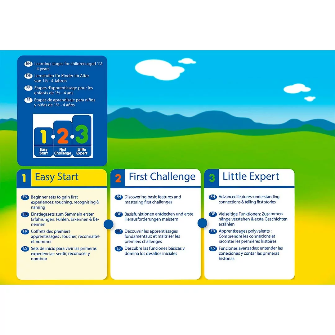 Los sets de juego Playmobil 1.2.3 se dividen en tres niveles de aprendizaje y así pueden apoyar continuamente el desarrollo del niño en los primeros años de vida. Gracias a las nuevas posibilidades de combinación y a las adiciones dentro del sistema de juego, los contenidos individuales del juego son siempre emocionantes y crecen a lo largo de varios años. En los juegos de iniciación con figuras sencillas, el aprendizaje se centra en sentir y explorar, imitar sonidos de animales y nombrar figuras, animales y objetos. ¿Dónde está el jinete? ¿Y qué hace el caballo?