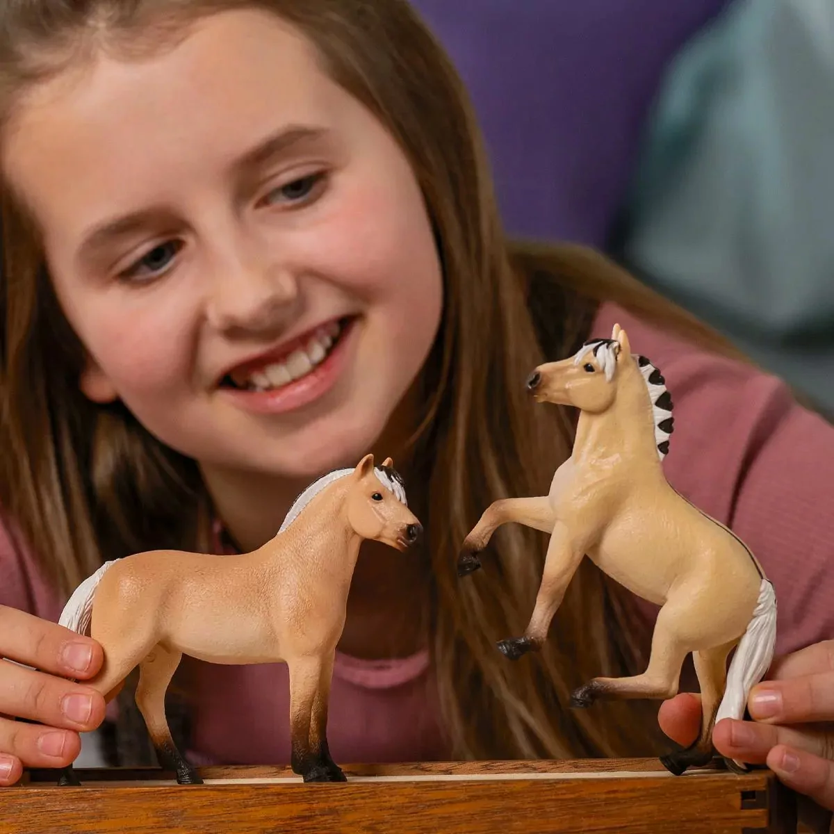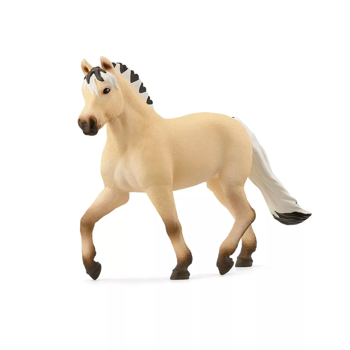 La simpática yegua fiordo es preciosa. Las pezuñas y el hocico son de color marrón oscuro, en contraste con el resto del pelaje, de un llamativo amarillo. Igual que el caballo fiordo (disponible por separado), tiene la típica línea de anguila en el lomo. Y, por supuesto, también tiene la marca distintiva de todos los caballos fiordo, la crin de dos colores, de la que está muy orgullosa, porque está erguida y así se resalta muy bien su color. ¿A que es encantadora?